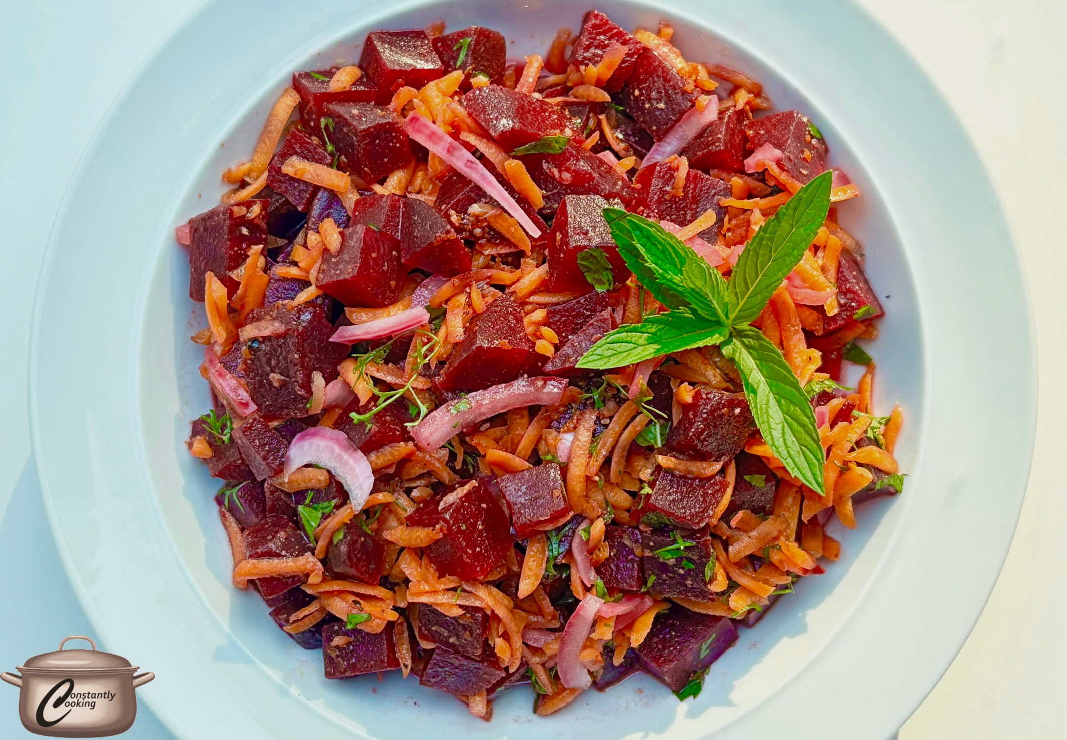- Add the grated carrot, onion, mint, and cilantro to the bowl. Drizzle with the dressing and toss gently until the beets are evenly coated.