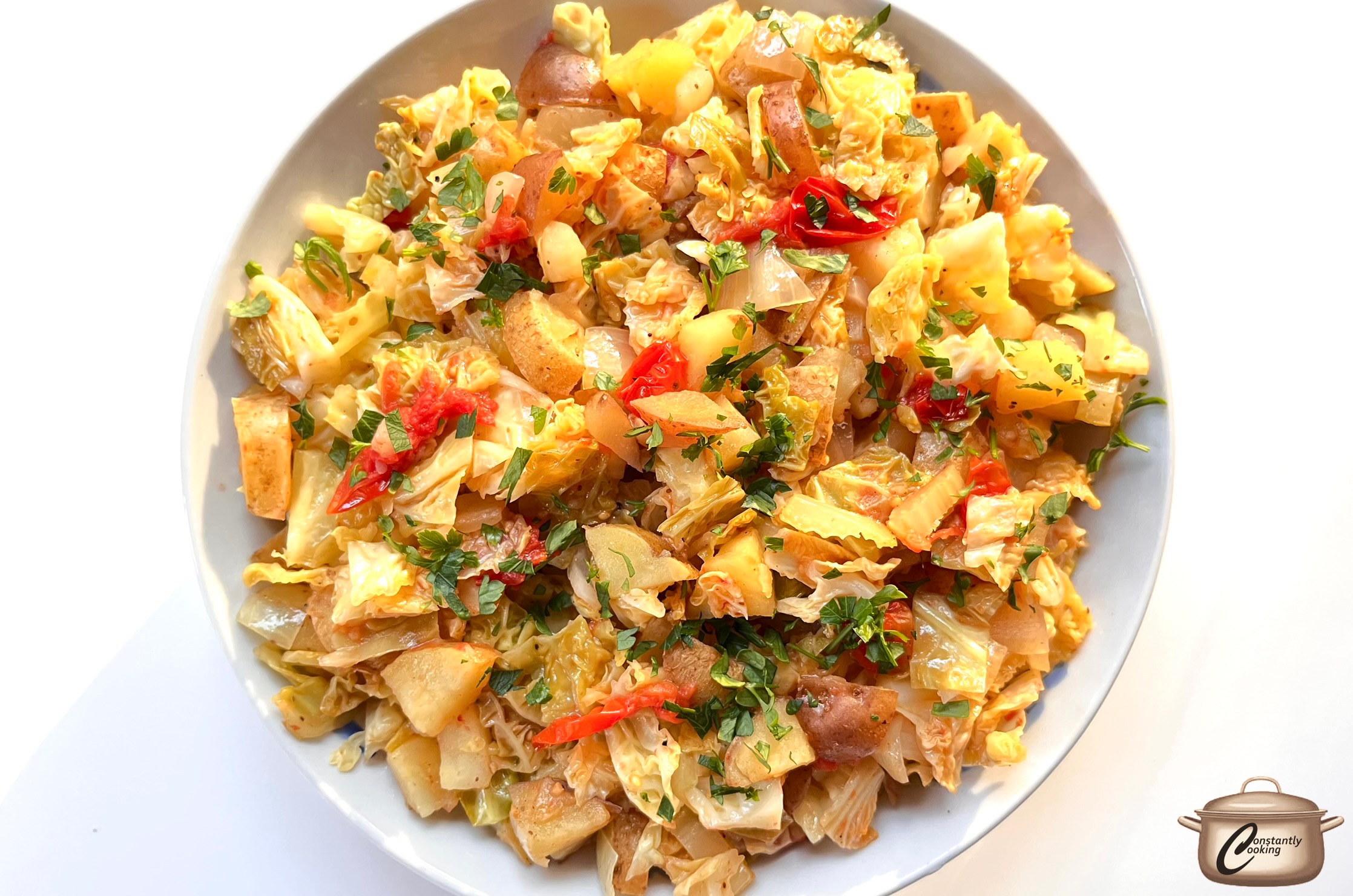 - Add the chopped cabbage and halved tomatoes to the skillet with the potato and onion mixture. Sprinkle with salt, pepper, celery seed and sugar then drizzle with vinegar and water. Gently stir to combine well. Cover and let cook, stirring occasionally, until cabbage has wilted and is tender.
