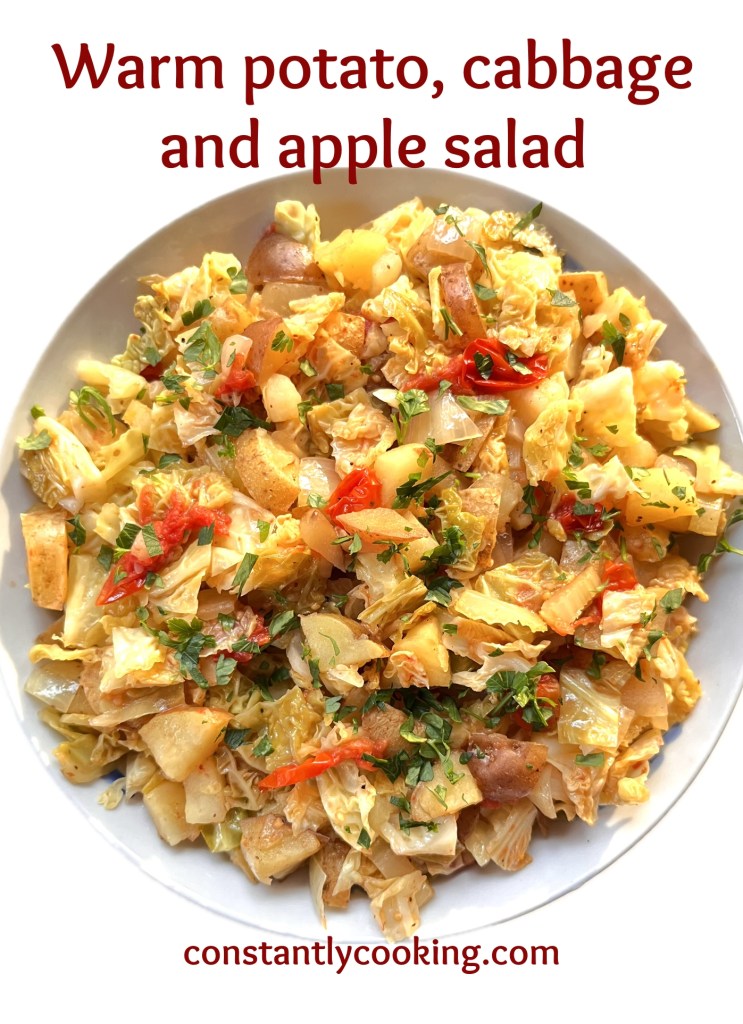 While my husband and I are the kind of nutty people who think nothing of grilling outdoors year-round (yes, even when it’s minus 20C and snowing like crazy), we do appreciate the joys of being able to fire up the barbeque in warmer weather to cook many of our meals. I’m always thinking about new vegetable side dishes to accompany whatever fish or meat we are grilling and a recent ‘clean out the fridge’ moment yielded this delicious sweet-and-sour salad that can do double-duty as a main dish if you like. If you like this dish, you might also enjoy my purple cabbage and apple salad, or one of the many other cabbage recipes on this site which you can find using the search tool.