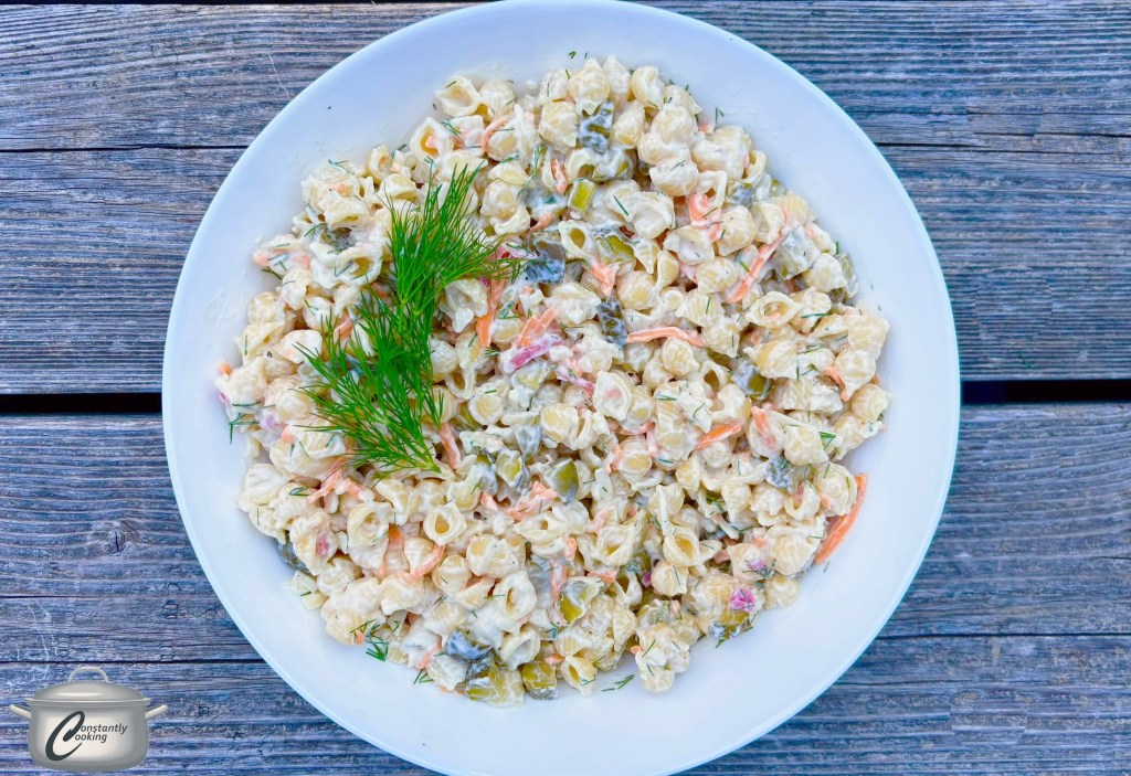 - When pasta has cooled to room temperature, add chopped pickles, grated cheese, chopped dill and pickled onions to the bowl; stir gently to combine.