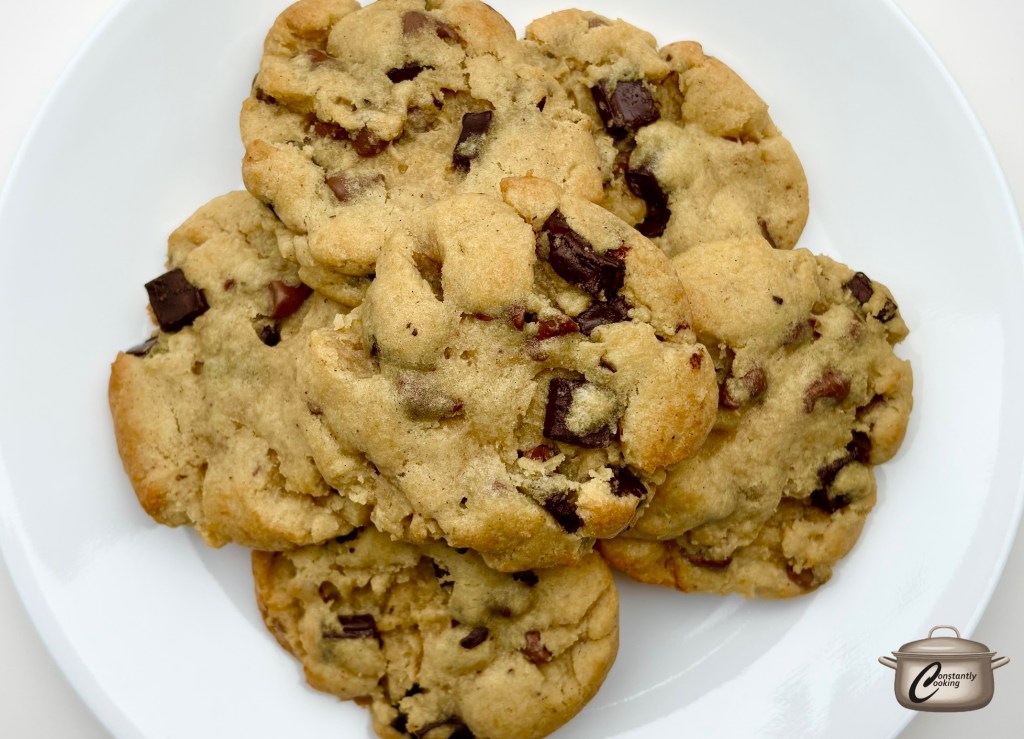 It took me a while to realize why cookies purchased at an artisanal bakery always taste so good. Sure, they use premium ingredients, but home cooks have access to those. What I figured out is that ‘pro made’ cookies are usually significantly larger than homemade ones, and that, understandably, adds a lot to their appeal. This recipe makes two dozen Very Large and Very Delicious cookies that are best when baked from frozen as they spread more slowly in the oven. And if you are looking for another exceptionally delicious cookie recipe, these old fashioned ginger cookies are my family’s all-time favourite.