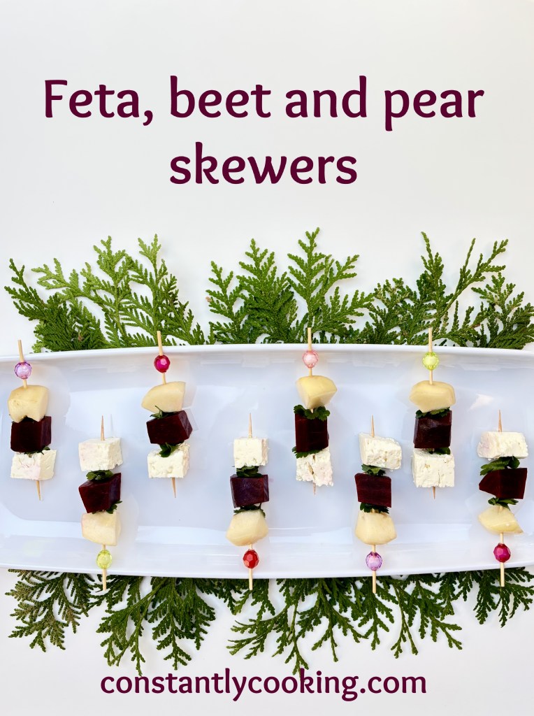• Thread one pear cube onto a skewer. Fold a flat parsley leaf in half or thirds and thread it on after the pear. Add one beet cube then another folded parsley leaf. Thread a feta cube on last. Repeat with remaining ingredients on additional skewers.
