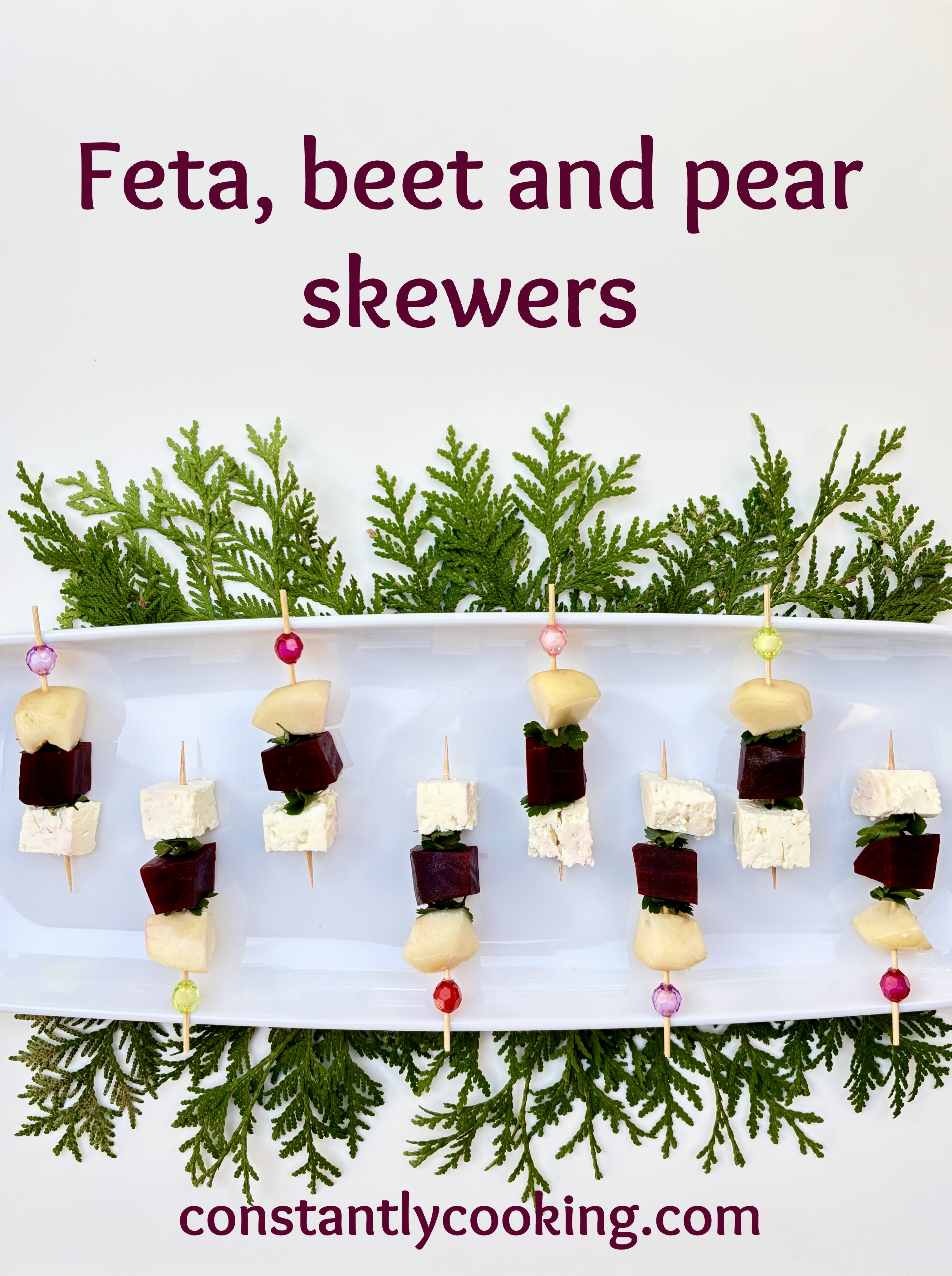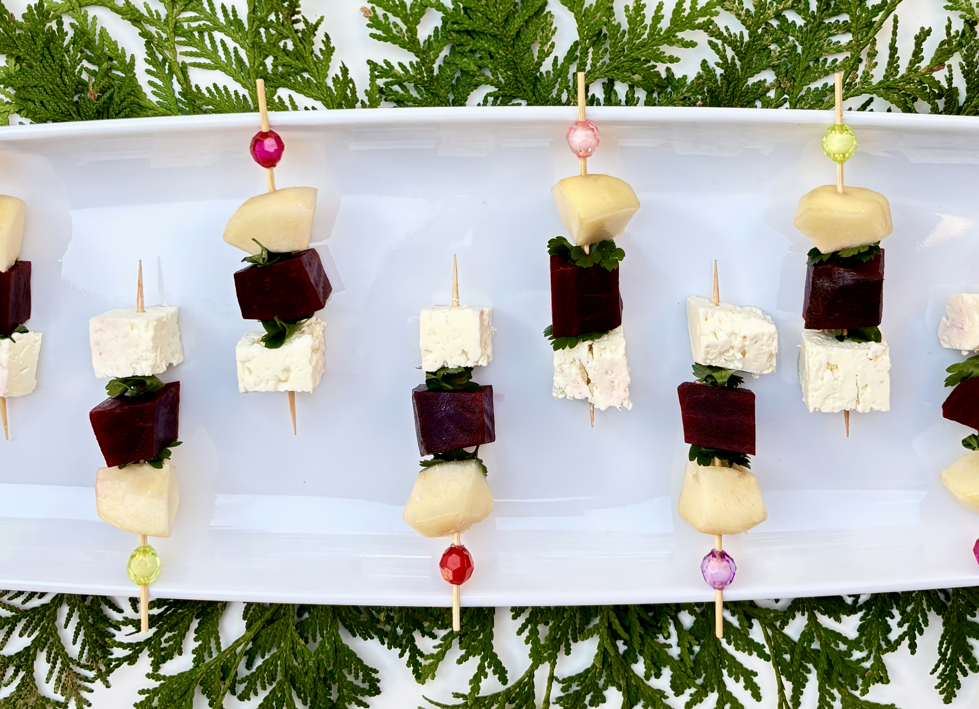 Beets and cheese have been a popular combination for decades and I love pulling this pair together in different ways, such as this tasty salad and these crowd-pleasing tarts. To elevate the presentation of these vegetarian treats I found some fancy skewers at my local dollar store; I’ve seen them at kitchen shops as well.