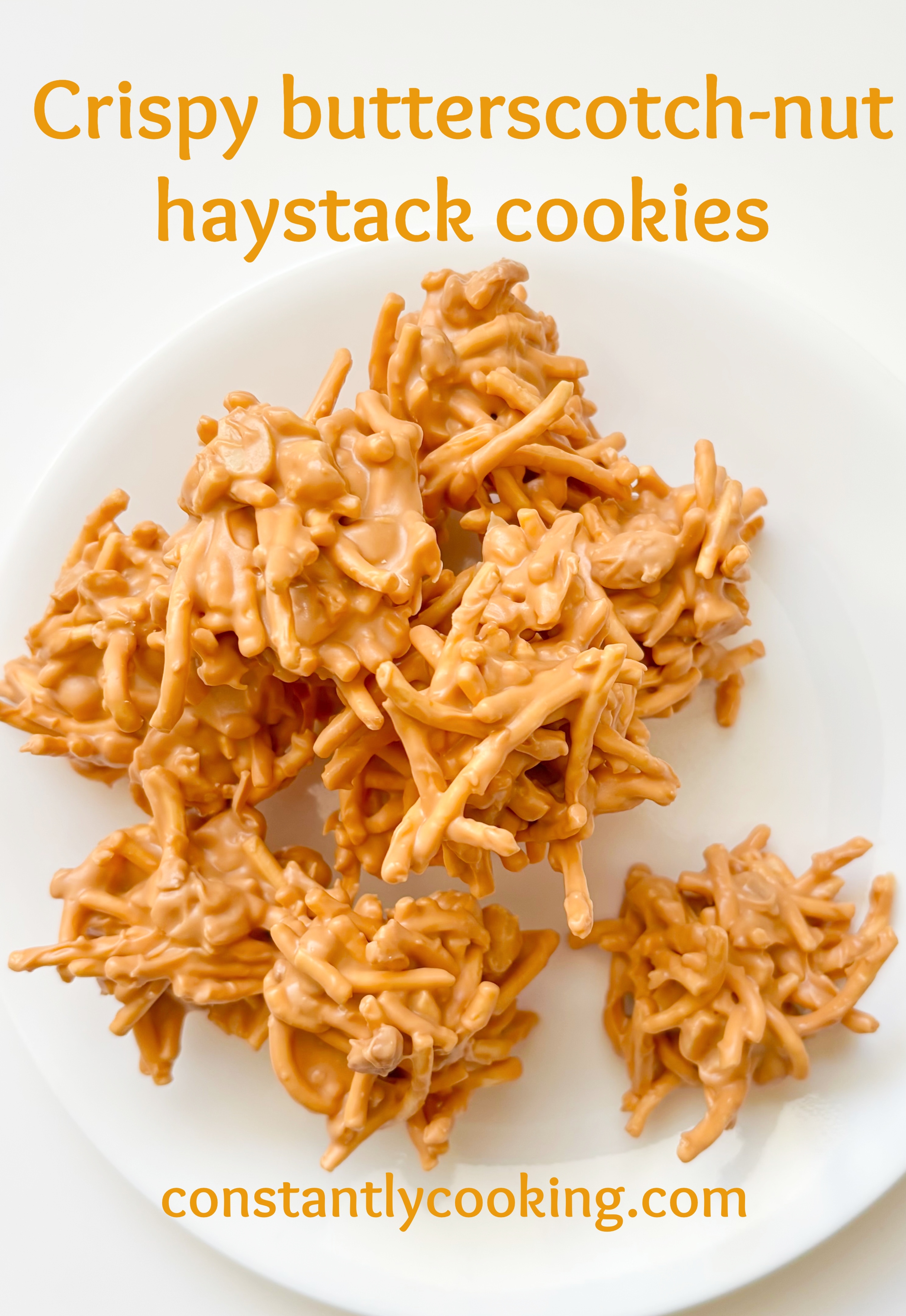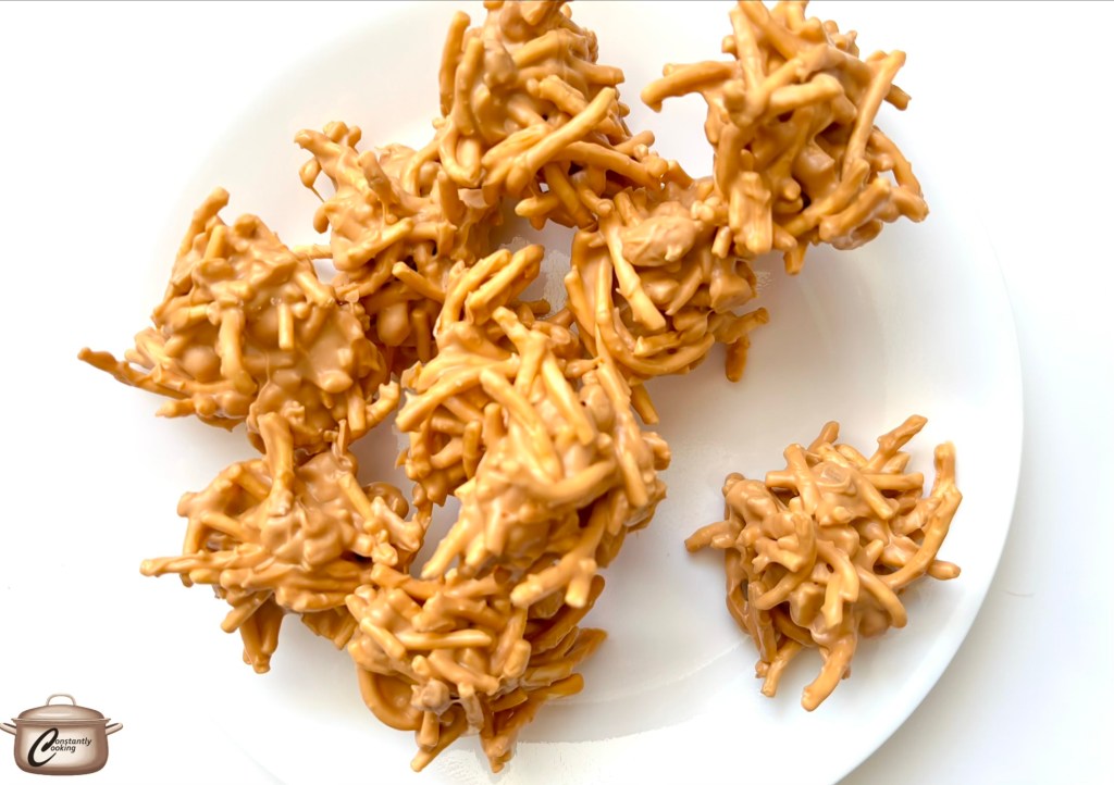 January is a big ‘clean out the pantry’ time for me, where I try to deal with the many opened boxes, bags and packets of things that are still reasonably fresh but need to be used up. Spying a half bag of crispy chow mein noodles (which I use as a topping for my delicious egg roll bowls) and a surplus of butterscotch chips purchased for Christmas baking, I decided to create a sweet treat. I remember my mom making something similar to these when I was a kid, but with chocolate chips. My taste taster gave these a 15 out of 10.
