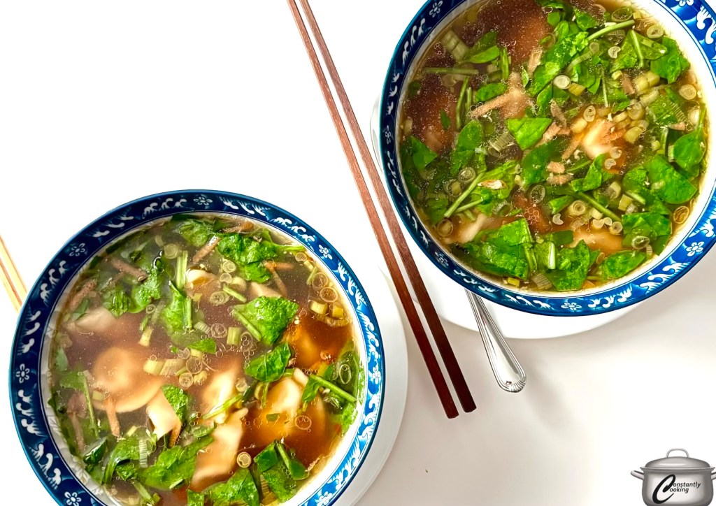 - Ladle soup into large bowls, dividing dumplings evenly among the bowls. Garnish with green onions and serve hot.