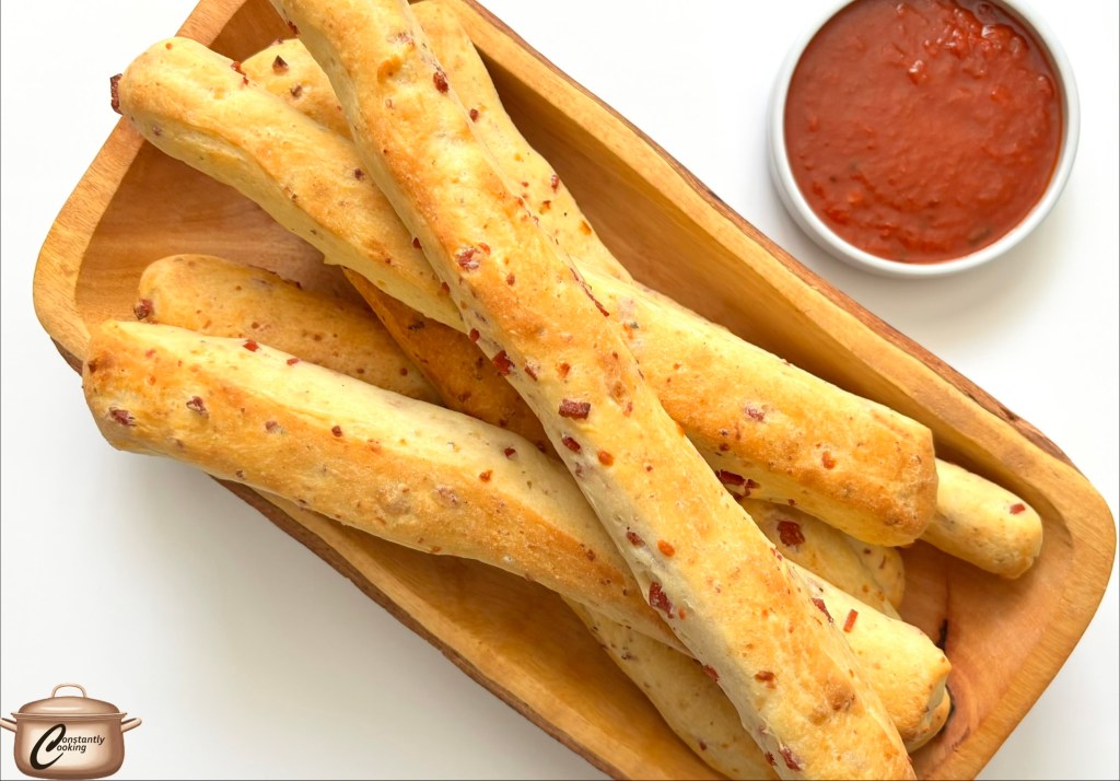 - Serve warm or at room temperature, with pizza sauce for dipping.