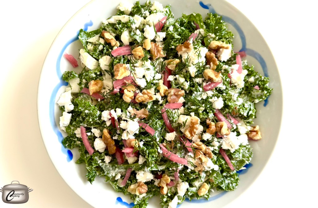 I realize that there are already seventeen kale recipes on my site, yet I make no apologies for adding another one as I find it’s just such a delicious and versatile ingredient. What sets this salad apart is the super-tasty ranch style dressing that’s amped up thanks to pureed dill pickles. We’re such fans of its flavour and texture that we use the dressing in many other ways, including as a sandwich spread, on pasta salad and as a dipper for vegetables. If you love dill pickles even half as much as I do, you might also enjoy this pasta salad recipe.