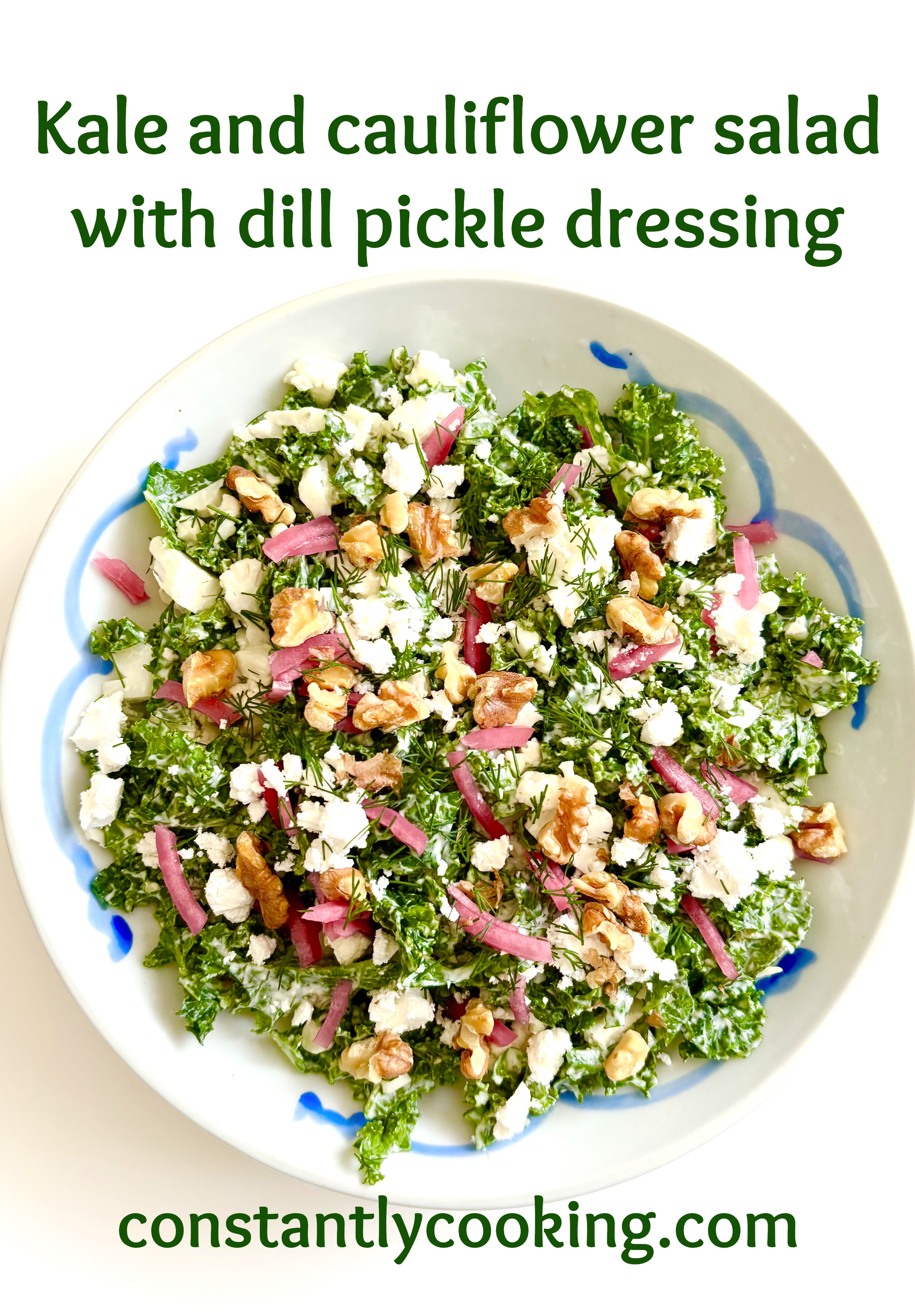 I realize that there are already seventeen kale recipes on my site, yet I make no apologies for adding another one as I find it’s just such a delicious and versatile ingredient. What sets this salad apart is the super-tasty ranch style dressing that’s amped up thanks to pureed dill pickles. We’re such fans of its flavour and texture that we use the dressing in many other ways, including as a sandwich spread, on pasta salad and as a dipper for vegetables. If you love dill pickles even half as much as I do, you might also enjoy this pasta salad recipe.