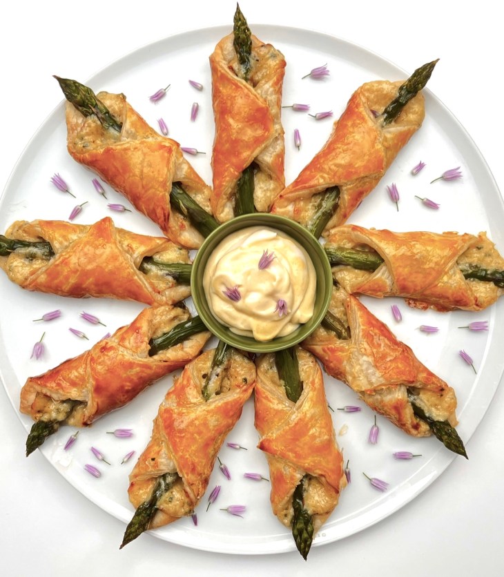 This savory treat is ideal for brunch or cocktails, featuring asparagus encased in puff pastry with a cheese and chive filling. They can be prepared ahead and refrigerated. After baking until golden, serve warm or at room temperature, garnished with herbs and accompanied by a dipping sauce made from leftover mayonnaise mixture.