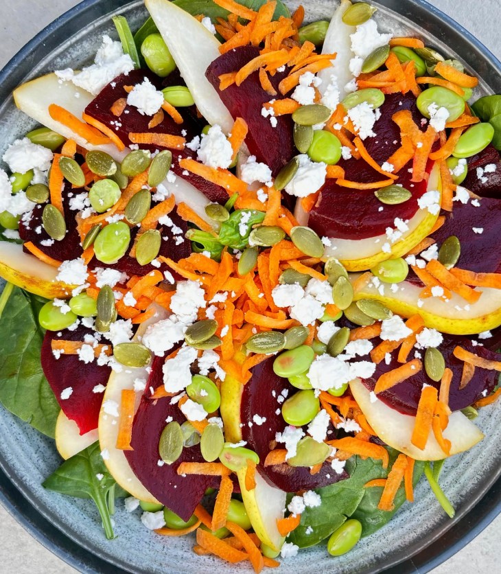 This vegetarian salad features nutrient-rich beets, edamame, pepitas, and feta, making it a flavorful staple. Quick preparation is possible with pre-cooked beets. The vinaigrette includes balsamic vinegar, Dijon mustard, and maple syrup. The recipe serves two and can be easily multiplied, offering healthy and delicious options.