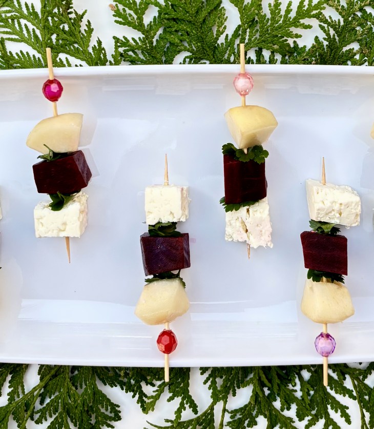 This festive appetizer features roasted beets, feta cheese, and pear on skewers, enhanced by fresh parsley. Each ingredient is cubed and arranged for an appealing presentation. The skewers can be prepared ahead of time and are perfect for vegetarian gatherings. One beet yields about ten skewers, making it easily scalable.