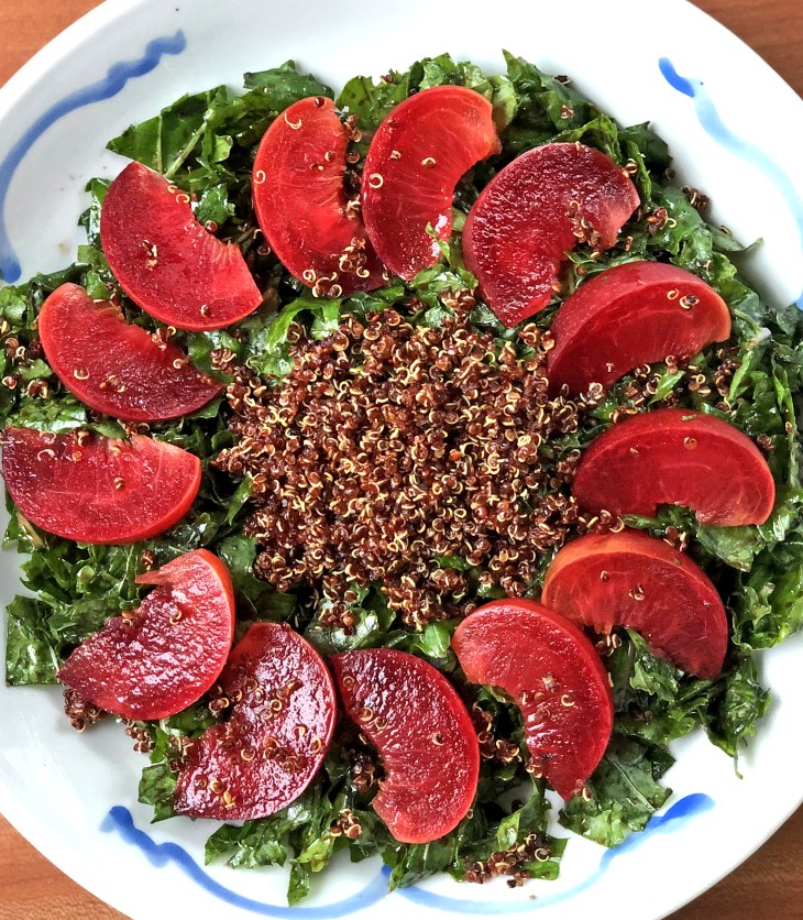 Kale salad with plums and crispy quinoa